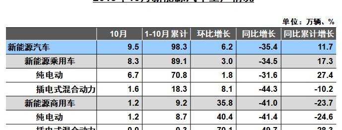 数据来源:今年10月,中汽协共生产新能源汽车9.5万辆,环比增长6.2%,同比下降36.4%;7.5万辆的销量环比下降5.9%,同比下降45.6%。具体来看,从车型来看,10月纯电动乘用车产量6.7万辆,环比增长1.8%,同比下降31.6%;5万辆汽车的销量环比下降11.3%,同比下降46.8%。10月,插电式混合动力乘用车生产1.6万辆,环比增长8.1%,同比下降44.3%;销售1.6万辆,环比下降0.6%,同比下降38.8%。10月,生产新能源商用车1.2万辆,同比增长40.4%,同比下降41.4%;9000辆汽车的销量环比增长24.1%,同比下降49.4%。