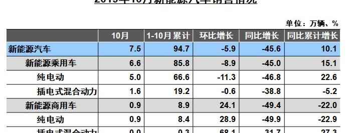 当其他产品在双十一当天销量强劲时,新能源汽车受到了打击。11月11日,中国汽车协会发布了10月份汽车产销数据。曾经蓬勃发展的新能源汽车市场再次遭受重创。在2019年补贴衰退之后,从7月到9月,它经历了连续三次下降。10月,新能源汽车销量出现明显下滑,仅售出7.5万辆,同比下降45.6%。10月也成为今年销量同比降幅最大的月份。