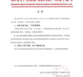 在现行的“三包”规定中,实现“车辆退换货”的条件相对严格。除了国家“三包”退换货政策外,东风日产还对“7天换保”做出了承诺,在现有条款的基础上,承诺客户在购买后7天内,如果主要部件在国家标准范围内出现具体质量问题,可以申请免费更换同型号、同级别、同颜色的新车。