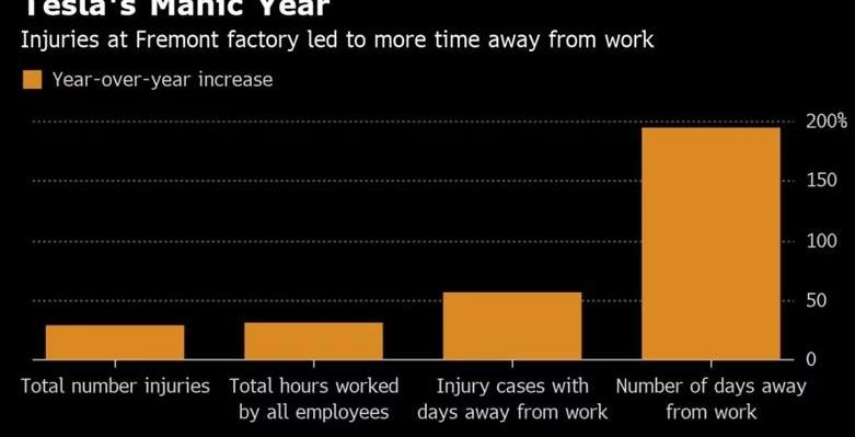据彭博社报道,2018年,特斯拉工厂员工因工伤和疾病休假的天数几乎是2017年的三倍,这表明特斯拉员工在首次大规模生产电动汽车期间承受着巨大的压力。根据特斯拉提交给美国职业安全与健康管理局的一份报告,2018年,该公司位于加利福尼亚州弗里蒙特的唯一装配厂的员工总共休息了22454天,远高于2017年的7619天。这一增长远远超过了工作时间、工伤率和员工缺勤率的增长。考虑到员工数量的增加,去年每位员工的缺勤时间翻了一番,特斯拉工厂的小时工伤率与2017年大致相同。在奥巴马总统任期内担任美国职业安全与健康管理局办公室主任的Deborah Berkowitz表示,特斯拉员工缺勤天数的急剧增加表明员工受伤情况越来越严重;员工的平均缺勤时间从2017年的35个工作日增加到2018年的66个工作日,这是一个令人担忧的数据。特斯拉反驳了上述结论,称员工缺勤天数与工伤率之间没有相关性。特斯拉负责环境健康与安全的副总裁Laurie Shelby在电话采访中表示,报告显示,尽管公司正在努力提高产量,但工伤率与总工作时间成正比。谢尔比说, “最重要的衡量标准是工伤造成的死亡人数,我们在这方面的数据为零。在过去两年里,特斯拉的工厂没有发生过死亡事件。2018年是Model 3产量快速增长的一年,因此工人总数和总工作时间都有所增加,相应的潜在事故率也有所上升,约占总产量的三分之二去年工厂里受伤的员工是由于累积受伤,这与身体某些部位的重复压力有关。此外,特斯拉声称给了员工休息和恢复的时间,这在一定程度上使他们的工伤数据看起来更糟。该公司表示,去年其整体工伤率略高于同行,汽车行业平均每年有4人死亡。长期以来,安全问题一直是特斯拉与其批评者之间的导火索。特斯拉的一些现任和前任员工表示,首席执行官埃隆·马斯克将生产目标置于工伤预防之上,特斯拉否认了这一指控。特斯拉表示,今年公司的工伤率和受伤员工的缺勤率可能会下降,因为公司实施了更强有力的复工计划,以帮助他们恢复不同岗位的工作。特斯拉表示,在生产过程的每一步都会考虑安全问题,这是日常会议中最重要的话题。