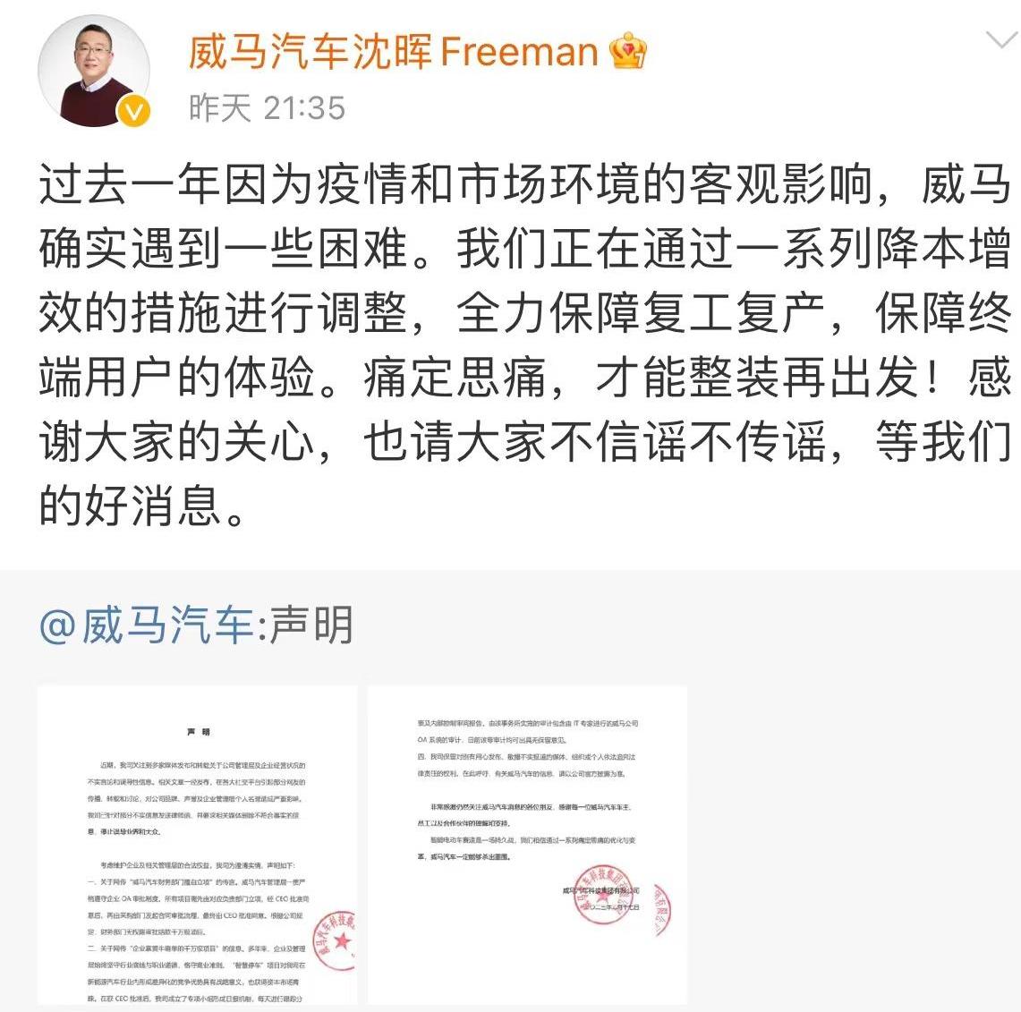 去年年底,威马为自救进行了大幅度降薪,包括威马高管降薪50%,员工降薪30%,年终奖取消。然而,随后的情况并没有明显改善。此前网上有传言称,威马将在原来30%的基础上降薪75%。沈晖随后的公开声明也基本证实了上述传言。