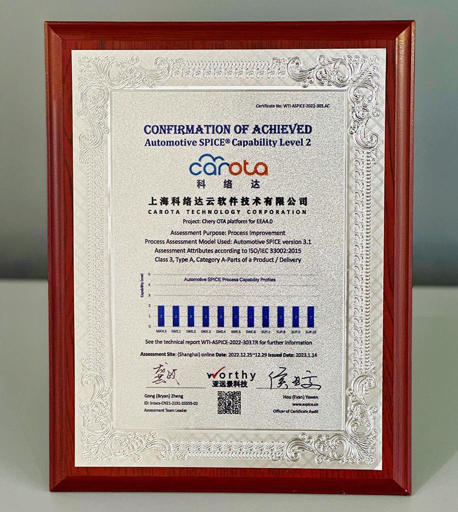 科洛达于2022年12月通过汽车Spice能力二级(以下简称“Aspice二级”)认证。ASPICE是一个用于汽车行业的软件评估和改进模型。它由德国汽车工业联合会(VDA)制定,是汽车软件开发的全球行业标准。其目的是指导汽车软件开发过程,保证开发过程的质量和持续优化,保证最终交付产品的质量。