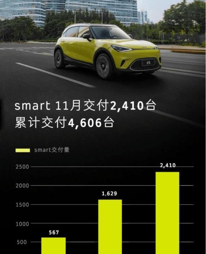 12月5日,纯电动汽车科技品牌smart正式公布了2022年11月份的交付数据:11月1日-30日,全新smart精灵#1在国内共交付2410辆。从9月23日正式开启交付到11月30日,smart在中国已交付4606台。
