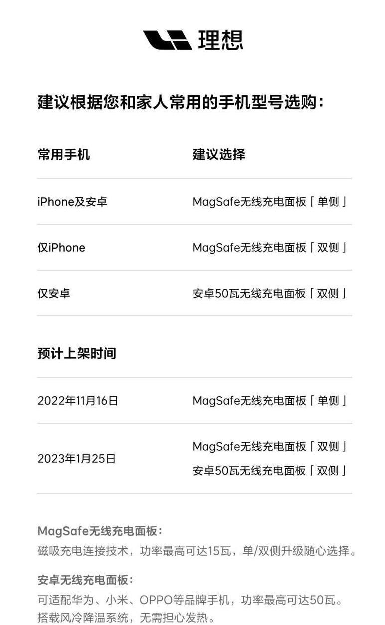 11月10日,Ideal官方宣布,支持磁充电连接技术的MagSafe无线充电面板将于11月16日面向Ideal L9、L8、L7上市。第一次发射只有一个侧板。明年1月25日,双面MagSafe无线充电面板将上架,可以同时为iPhone和Android手机充电。