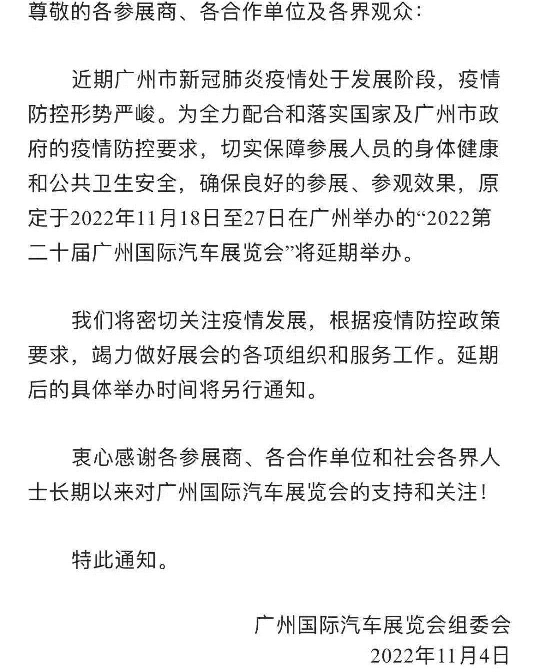 11月4日,广州国际汽车展览会组委会宣布,原定于2022年11月18日至27日在广州举办的2022年第20届广州国际汽车展览会延期举行,延期后的具体时间另行通知。
