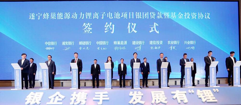 签约银团主要由中国建设银行遂宁分行、中国银行遂宁分行、建信投资、邮政储蓄银行、浦发银行、农业银行、兴业银行、中信银行组成。遂宁市委书记姜立和蜂巢能源董事长兼首席执行官杨洪信出席了签约仪式。