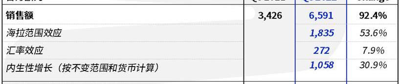 →第三季度销售额达66亿欧元,在报表基础上增长92%,内生增长31%。