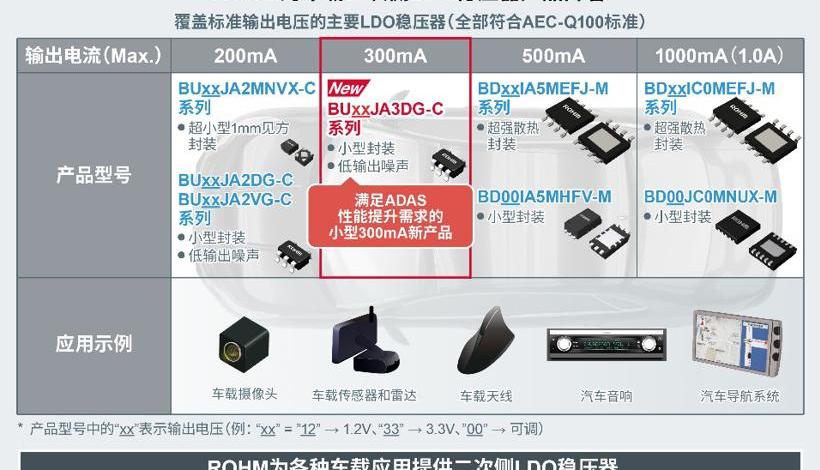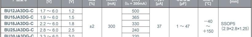 新产品“BUXJA3DG-C系列”满足车载产品的基本要求,如工作在125℃,满足汽车电子产品“AEC-Q100”的可靠性标准,车载二级LDO稳压器要求的小封装尺寸,以及输出电压扩展的需求。