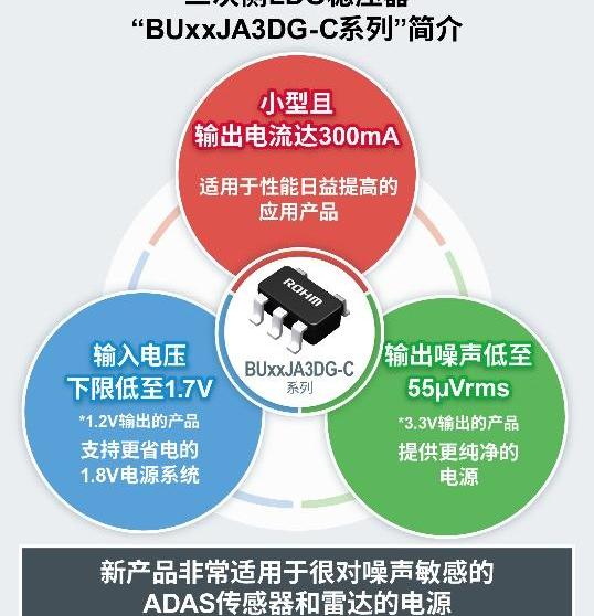 全球知名半导体制造商ROHM(总部位于日本京都)针对ADAS(高级驾驶辅助系统)性能日益提升的小型车辆应用,开发了LDO稳压器* 1c”buxx ja 3dg-C系列(BU12JA3DG-C、BU15JA3DG-C、BU18JA3DG-C、BU25JA3DG-C、Bu330)。