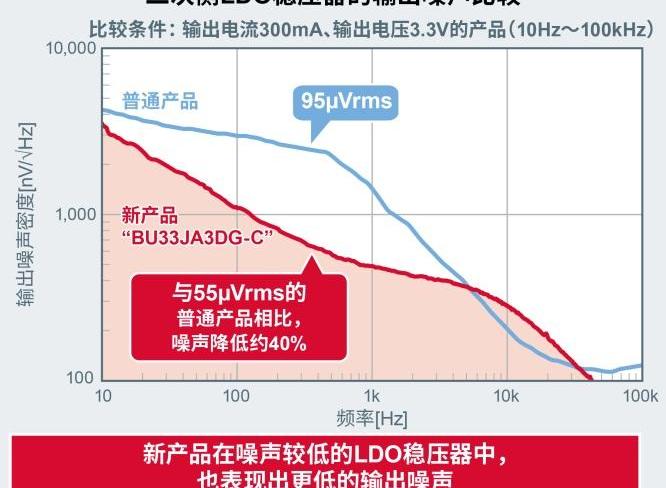 此外,虽然体积很小,但支持高达300mA的输出电流,同时该系列产品还覆盖了1.7V至6.0V更宽的输入电压范围,即使在1.7V输入电压、300mA输出电流的条件下也能稳定工作,因此也可用于1.8V电源系统(适用产品:BU12JA3DG-C)。而且输出噪声降低到55 Vrms,比普通产品(输出电压为3.3V的产品相比)低40%左右,不易影响传感器等微小电信号的输出(有助于提高精度),非常适合日益小型化、性能提升的噪声敏感型车载产品的电源。