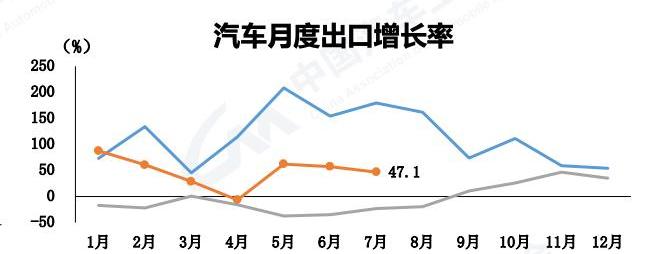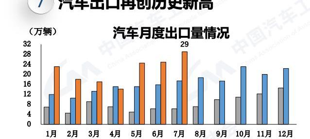 1-7月汽车企业出口150.9万辆,同比增长50.6%,全年出口有望突破240万辆,符合年初预期。分车型看,乘用车出口118.6万辆,同比增长54%;商用车出口32.2万辆,同比增长39.2%。