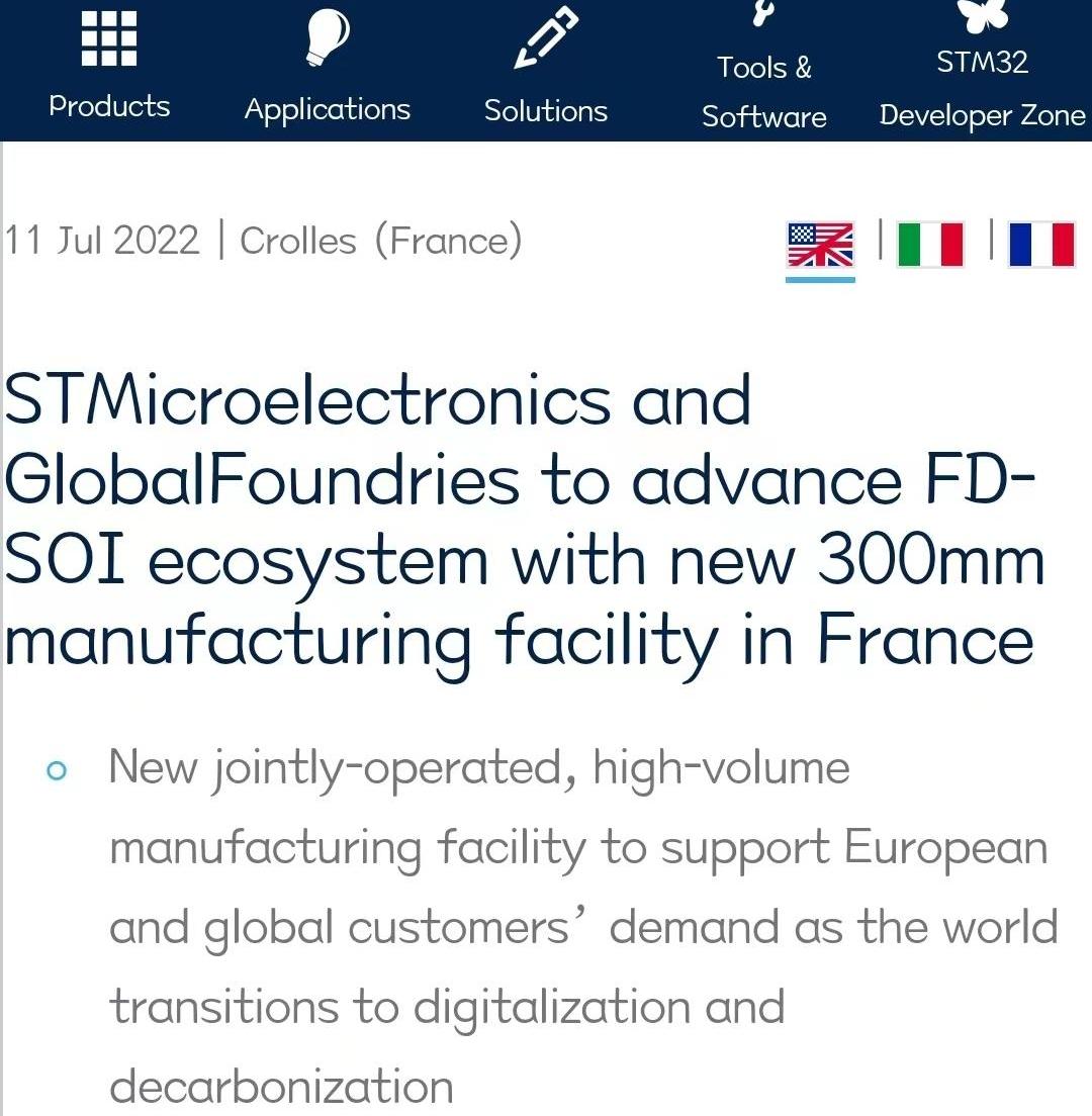 7月11日,意大利芯片制造商意法半导体(STM)和美国芯片制造商Global Foundries宣布,他们已经签署了一份备忘录,将在法国联合建设一家新的晶圆厂。根据stmicroelectronics (STM)在官网的说法,新工厂将建在STM位于Crolles,Crolais的现有工厂附近。目标是2026年全面投产,全面建成后每年可生产多达620,300 mm (12英寸)的晶圆。这些芯片将用于汽车、物联网和移动应用,新工厂将创造约1000个新工作岗位。