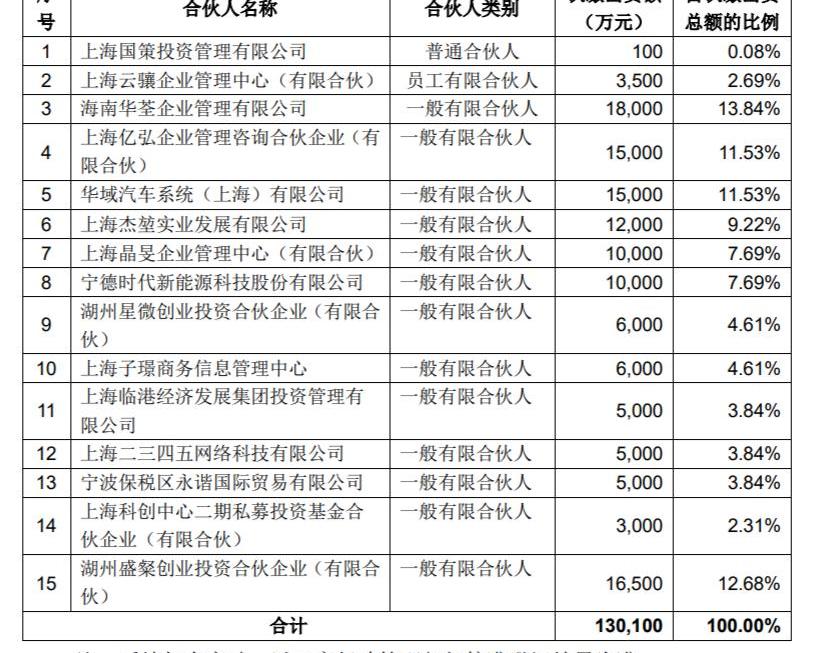 资料显示,合伙企业认缴的出资总额为13.01亿元。作为有限合伙人,中国汽车系统(上海)有限公司和当代安普科技有限公司新能源科技有限公司拟分别认购1.5亿元和1亿元,分别占总认缴股本的11.53%和7.69%。
