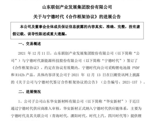 联创股份在公告中指出,华安新材料成为当代安普科技有限公司的正式供应商,此次正式合作表明当代安普科技有限公司对公司锂电池级PVDF产品的进一步认可,将有助于加强公司与当代安普科技有限公司长期稳定的合作关系,有利于公司未来经营业绩增长和持续盈利能力的提升。3月2日,联创股份发布公告称,子公司山东华安新材料股份有限公司(以下简称“华安新材”)近日在当代安培科技有限公司通过供应商准入审核,华安新材在当代安培科技有限公司正式纳入供应链体系,主要为当代安培科技有限公司及其关联公司(青海时代、溧阳时代、SAIC时代、四川时代等)提供锂电池级PVDF(聚偏氟乙烯,锂电池最常用的正极粘结剂)产品。).