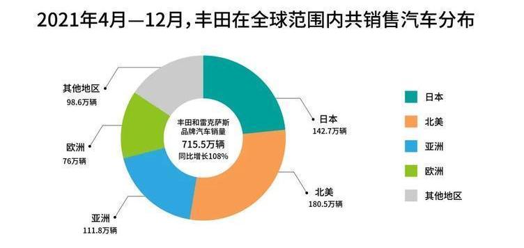 数据显示,2021年4-12月,丰田全球共销售汽车609.6万辆,同比增长112.1%,丰田和雷克萨斯品牌汽车共销售汽车715.5万辆,同比增长108%。其中,日本和北美是丰田的主要市场,分别售出142.7万辆和180.5万辆,亚洲售出111.8万辆,欧洲售出76万辆,其他地区售出98.6万辆。基于此,2021年4-12月丰田利润率进一步提高,达到10.9%,2020年4-12月这一数据为7.7%。