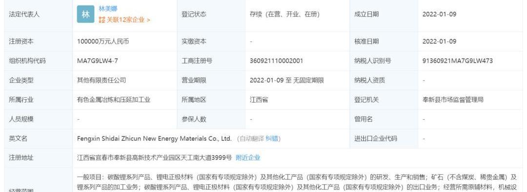 企业调查显示,2022年1月9日,奉新时代智存新能源材料有限公司成立,注册资本10亿元。股东资料显示,该公司由当代安培科技股份有限公司(300750)和江西智村锂业股份有限公司共同持有..