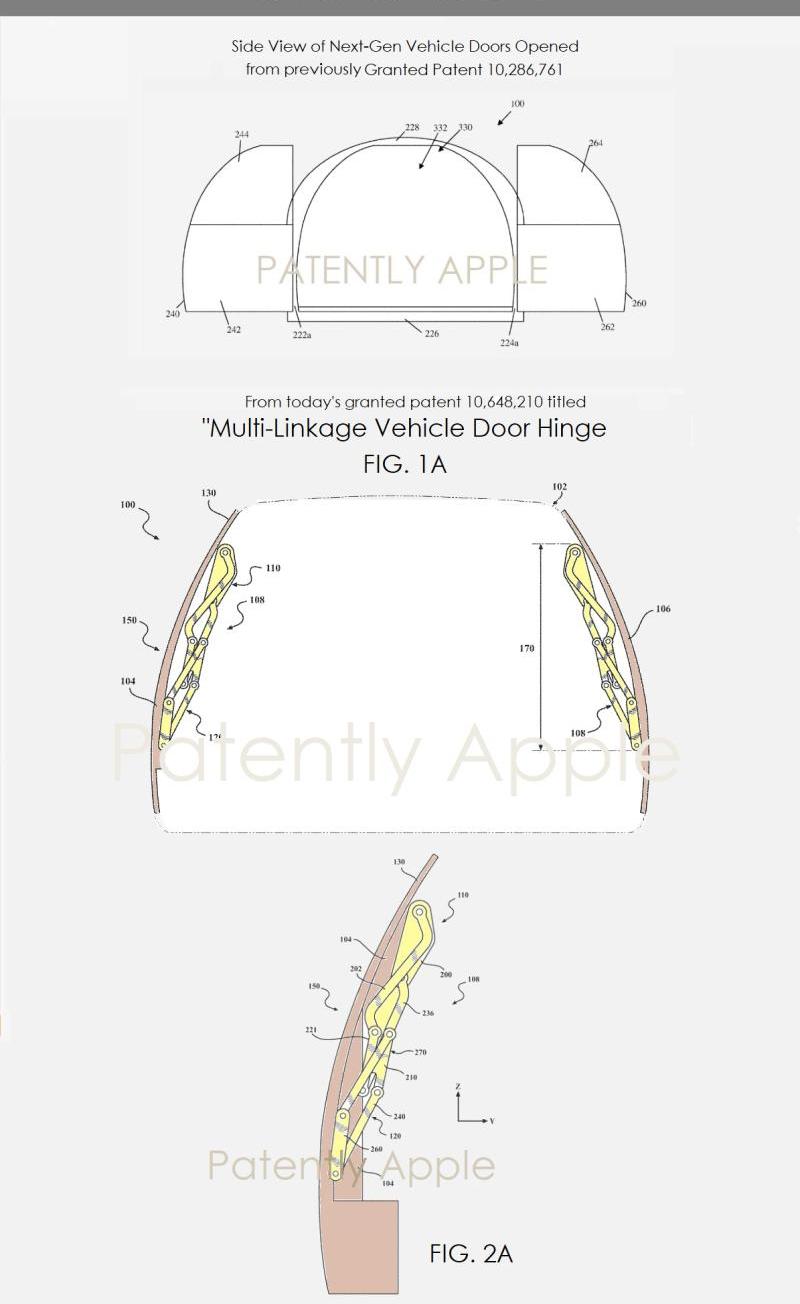 苹果获得的两项泰坦专利中,第一项是“多连杆门铰链”。使用该系统,门板可以非常紧凑和有效地移动,每个门可以以很小的间隙打开和关闭,并且几乎所有的门都允许打开以进出机舱。