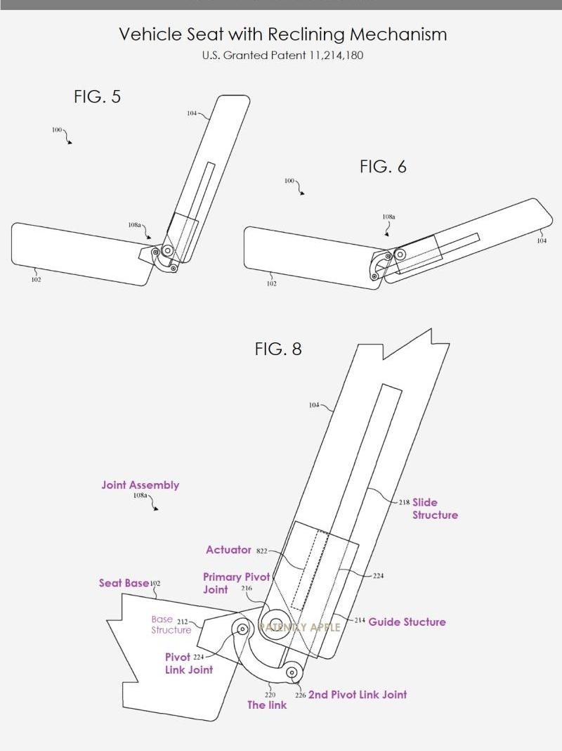以下苹果专利的图5是处于直立位置的车辆座椅的侧视图;图6是处于倾斜位置的车辆座椅的侧视图;图8是配备有致动器的车辆座椅的侧视图。