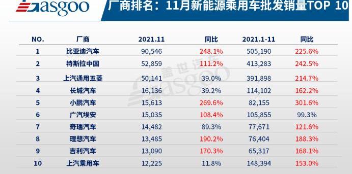 自主品牌的实力与他们在新能源市场的接连胜利有很大关系。在新能源汽车领域,比亚迪、SAIC乘用车、广汽乘用车等传统品牌实现了大幅增长。其中,比亚迪新能源乘用车1-11月累计批发销量达50.5万辆,同比增长225.6%;SAIC乘用车近15万辆,同比增长153%;长城汽车约11.4万辆,同比增长162.2%。