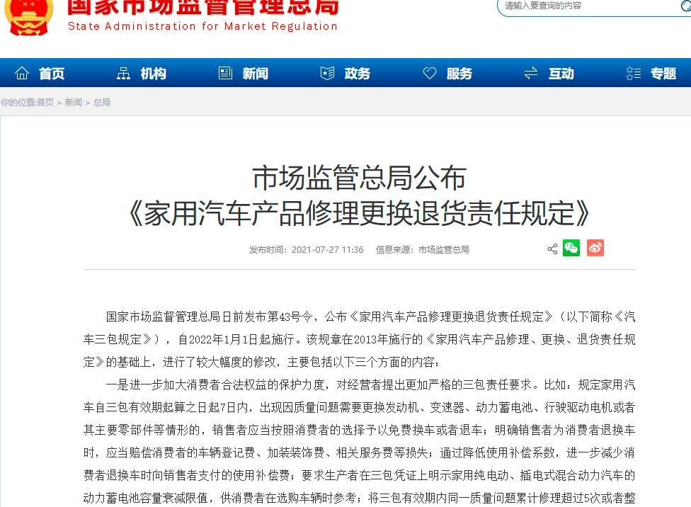 2021年7月,国家市场监督管理总局颁布《家用汽车产品修理、更换、退货责任规定》,“新三包”纳入新能源汽车相关内容,进一步规范新能源汽车市场。同时“新三包”赔付更多,配套更全,处罚更重。如果商家拒不履行三包,原来的罚款由1万元改为3万元,最高罚款50万元。规定一出,将引发汽车行业和消费市场的强烈反响。