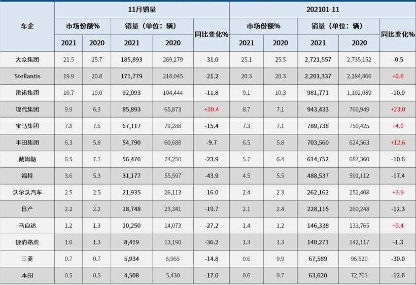 根据ACEA的数据,2021年11月,由于芯片短缺,欧洲新车注册量为864,119辆,同比下降17%,连续第五个月下降,也是1993年以来同期最低,这反映了欧洲汽车业从供应危机中复苏缓慢。
