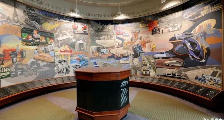 汽车名人堂荣誉厅的圆形壁画以90幅画作描绘了汽车历史上的重要事件,反映了汽车对社会生活的影响。在下面的黑色大理石上,刻着名人堂获奖者的名字。
