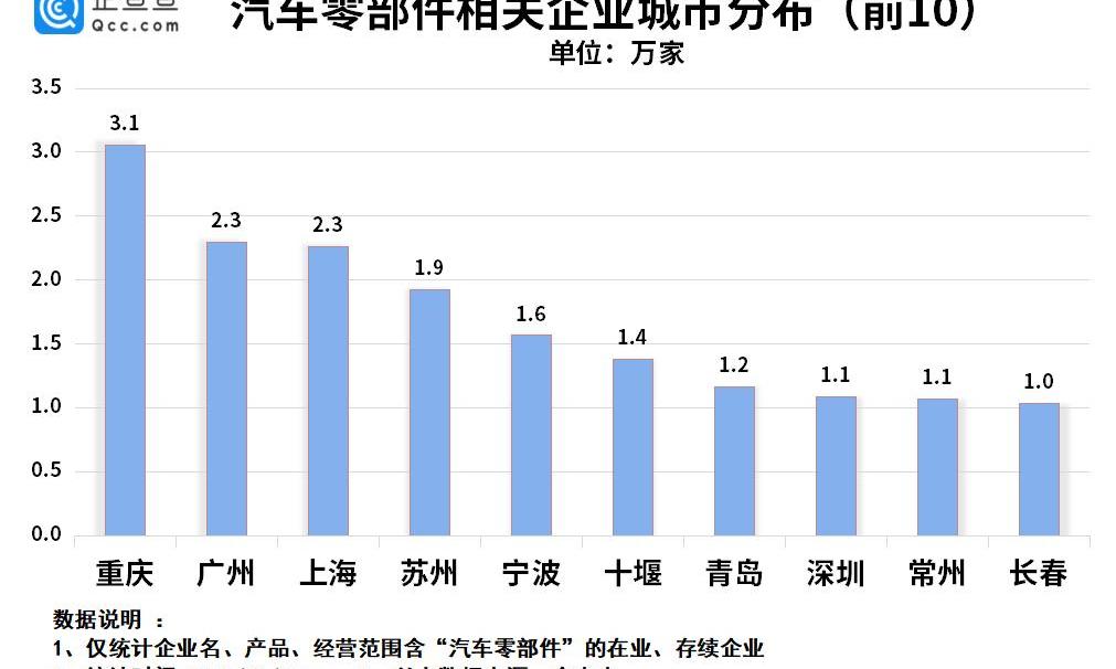 从国内零部件企业分布来看,江苏省以7.5万家位居第一,山东和浙江紧随其后,分别以5.7万家和5.6万家零部件相关企业位居第二和第三。从城市分布来看,国内零部件相关企业前三名分别是重庆、广州和上海,其中重庆有3.1万家,广州和上海有2.3万家。