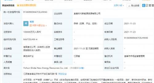 11月24日,当代安普科技有限新能源科技有限公司(以下简称“当代安普科技有限”)新增对外投资,投资企业为宜春时代新能源资源有限公司,投资比例为100%。