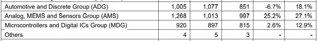 但受疫情影响,意法半导体马来西亚制造厂减产比预期严重,导致汽车及分立器件(ADG)产品部门收入下滑。该部门营收10.05亿美元,同比增长18.1%,环比下降6.7%。与此同时,该部门营业利润保持高速增长,达到1.08亿美元,同比增长120.6%,营业利润率从去年同期的5.8%提升至10.8%。