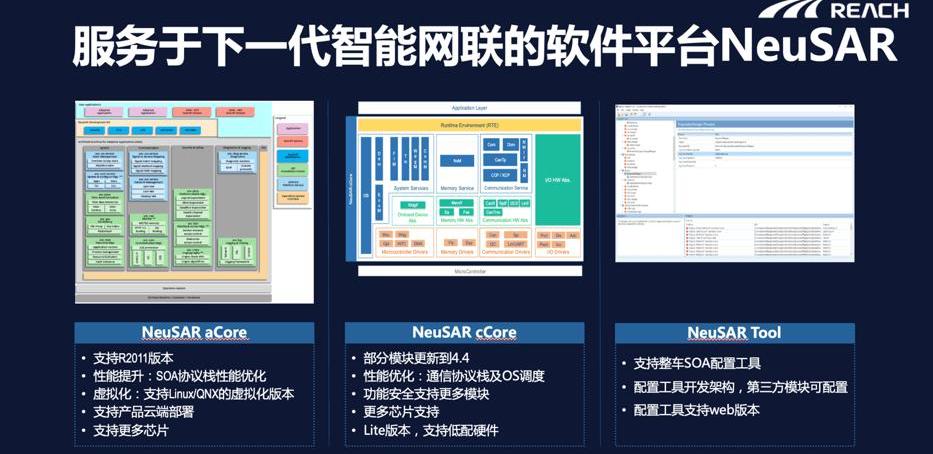 同时我们推出了下一代软件平台NeuSAR,我们有很多应用案例,无论是传统的车身控制器,新能源控制器等。,我们都有很多案例、经验和教训,在过程中不断积累和完善,所以我们也希望将这些基础软件部分与OEM厂商、Tier1供应商合作,同时提供丰富的工具链产品。这是我们的中间件。我们把零基础必须要做的部分变成核心部件,为OEM和部件供应商搭建自己的系统。同时,我们在行业内有很多合作伙伴,我们会把通用的部分提炼出来,聚集在一起,形成标准化的通用部件。这些组件在未来会被迭代开发,包括SOA框架的开发。
