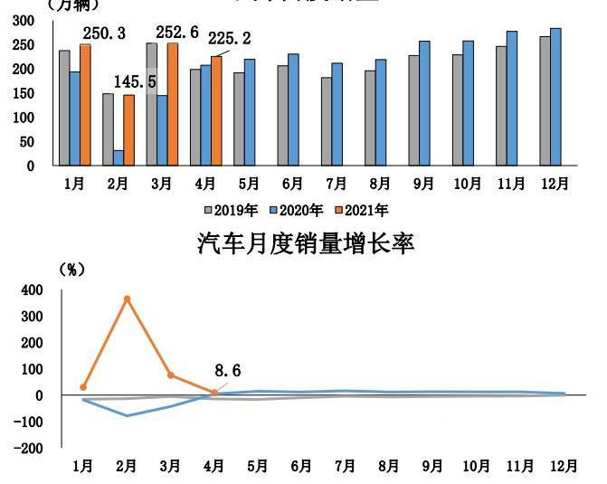 具体来看,4月份,汽车产销分别完成223.4万辆和225.2万辆,环比下降9.3%和10.8%,同比增长6.3%和8.6%。车市从去年4月开始逐步复苏,本月增速较3月分别回落65.4和66.3个百分点。与2019年同期相比,产销同比增长8.7%和13.5%,增速比1-3月分别提高12.7和13.5个百分点。1-4月汽车产销858.6万辆和
