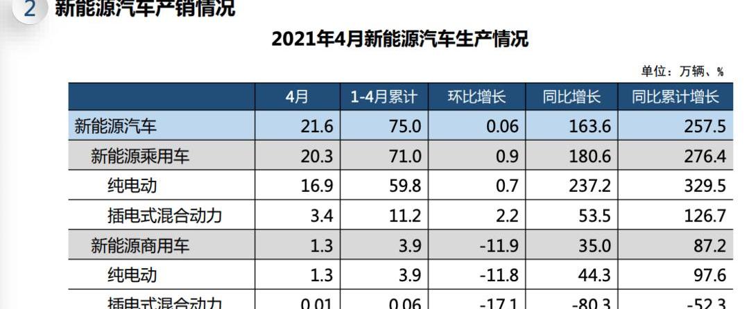 1-4月,新能源汽车产销分别完成75万辆和73.2万辆,同比分别增长2.6倍和2.5倍。其中纯电蒸汽
