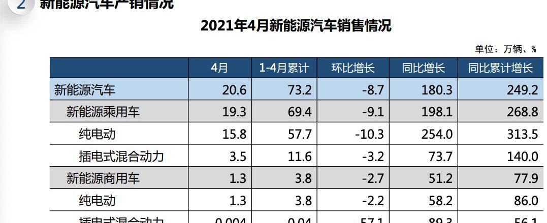11.3万辆和11.7万辆,分别增长1.2倍和1.4倍;燃料电池汽车产销分别为140辆和188辆,同比分别下降52.1%和32.9%。5月12日,中汽协发布2021年4月汽车行业产销情况。今年1-4月,汽车市场继续呈现稳中向好的发展态势。从市场情况来看,由于2020年4月汽车产销逐步回暖,低基数带来的高增长影响明显减弱,因此当月产销同比增速较上月明显回落,但在累计数据上,与2019年同期相比,产销形势仍呈现良好发展态势。从细分车型来看,乘用车和商用车的产销情况与行业基本一致;乘用车中,SUV单月产销量大于轿车,使用中国品牌。