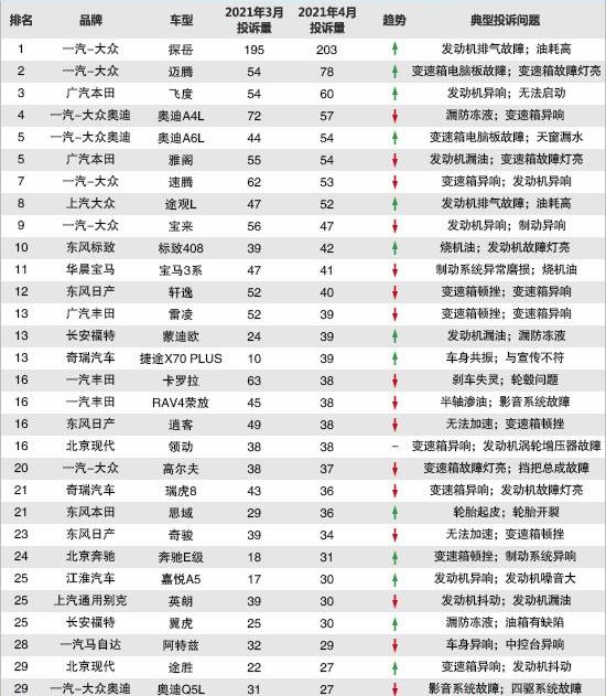 数据显示,车置宝受理的有效投诉信息。该网站本月涉及654款车型,其中有118款车型的投诉达到两位数。此外,本月Chezhi.com共收到7,335份汽车公司的投诉回复(包括前几个月的一些投诉回复)。剔除投诉人因车企已妥善解决而主动申请撤回投诉的信息后,2021年4月投诉量前30名的汽车(车型)排名如下: