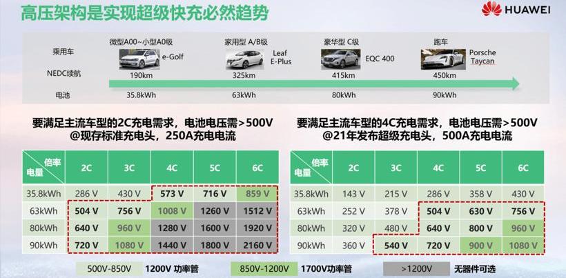 充电标准方面,2021年,充电头将由原来的950V(250A)标准改为1000V(600A)的超级充电头。未来不同标准的主流方向是1000-1500V和500-600A系统,从而支持超级快充。二、高压快充吸引多方布局,全球逐渐向目标迈进。王超认为,高压架构是实现超级快充的必然趋势。很多充电巨头其实已经开始了高压快充超级桩的布局,预计2021年我们会逐步向目标迈进。从海外情况看,欧洲CEF出资建设高速充电设施,呈现快速发展趋势,基本可以满足高电压快速充电模式。在国内,从2018年开始,高压桩逐渐布局。基于不同的主要运营商,500V以下的低压桩数量约为11万根,500V以上的高压桩数量为18万根。与车企担心的情况不同,高压桩占比一直高于低压桩,未来三年仍将快速发展。我们认为,到2022年左右,部署的高压桩可以基本匹配电动汽车批量使用,提前两年满足快充需求。王超表示,虽然部分车企对高压桩的布局仍有顾虑,但很多车企已经提前布局高压平台。从2021年开始,高电压快充体验将成为电动车市场差异化体验的重要标准。针对主流车型的需求,王超介绍,从A00到豪华型,从35.8 kWh到100 kWh以上,基于电池所能承载的不同电量、不同充电率的车型,基本上整车的电气架构在满足主流车型2C需求的情况下需要大于500V。未来超级充电头启用后,基于主力机型4C的充电需求,大于500V的电气架构也将是必经路径。