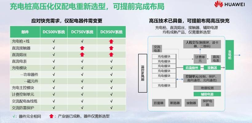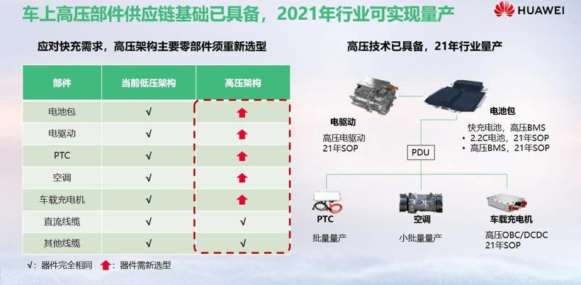 500V以下电气架构的存在主要受650V和750V功率半导体器件的限制。王超预测,2024年左右,基于1200V和1700V的碳化硅器件的成熟,将帮助行业在7.5分钟快充体验上实现质的飞跃。第三,高压快充技术基本具备,2021年可实现量产。如果采用高压架构平台,电动车的电池组、电驱动、PTC、空调都需要重新适配。基于技术的快速迭代,一旦产业链成熟,可以快速拉低整个行业的成本,预计2021年可以实现行业量产的目标。从堆的角度来看,成熟度比车好很多,除了充电、电线、接触器、保险丝会有一些差异,其他设备不需要改动。