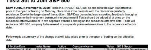 当地时间11月16日,S&P道琼斯指数发文宣布,将在12月21日开盘前将特斯拉纳入标普500指数,这与12月该指数季度调整的生效日期一致。
