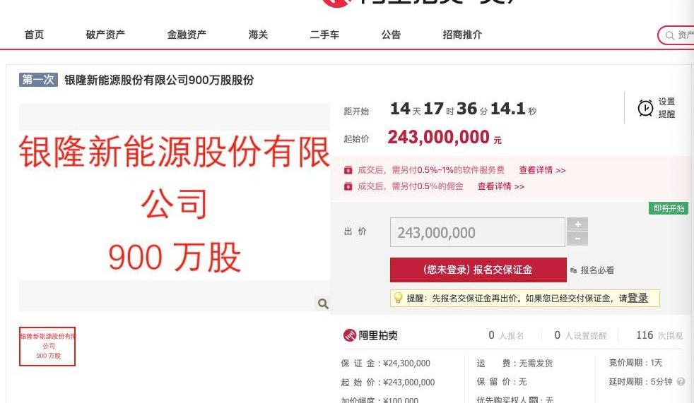 近日,银隆新能源股份有限公司“现身”阿里拍卖网,其持有的2395万股股份将分别于10月17日、20日、25日、29日进行拍卖,由被执行人委托珠海和平拍卖有限公司进行拍卖。四次拍卖总价为64665万元。