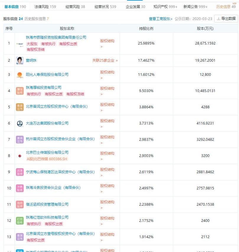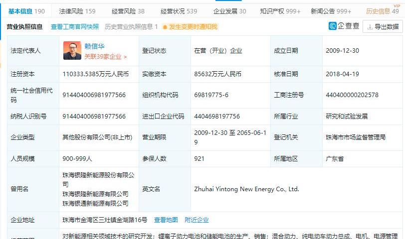 企业搜索APP显示,银隆新能源有限公司成立于2009年,法定代表人为赖新华,实收资本8.56亿元。其业务范围包括:新能源相关领域的技术研发;锂离子动力电池和储能电池的生产和销售。根据股东信息,公司目前有24名股东。第一大股东为珠海银隆投资控股集团有限公司,持股比例为25.98%。第二大股东为董明珠,持股比例为17.46%;第三大股东为阳光人寿,持股比例为11.60%。