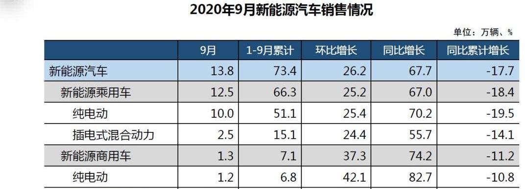 1-9月,新能源汽车产销分别完成73.8万辆和73.4万辆,同比下降18.7%和17.7%,降幅比1-8月分别收窄7.5个百分点和8.7个百分点。新能源汽车主要品种中,与去年同期相比,纯电动汽车和插电式混合动力汽车产销均同比下降,降幅较1-8月继续收窄,其中插电式混合动力汽车降幅已收窄至1%以内。