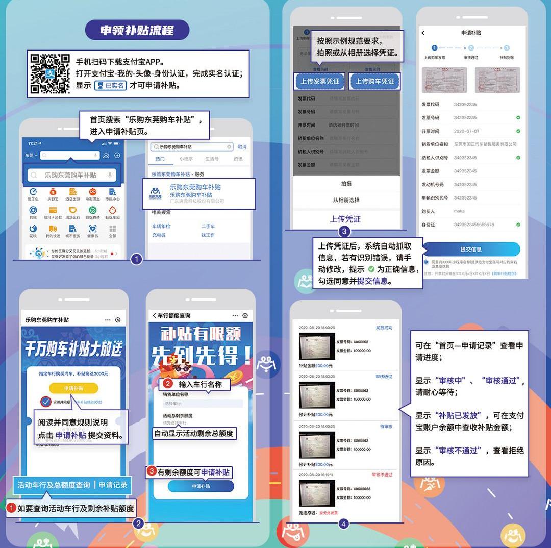 符合条件的消费者可在支付宝APP中搜索“乐购东莞购车补贴”小程序,按要求提交申请。后台审核和检查后,相应的购车补贴会直接发放到消费者的支付宝账户。先到先得。