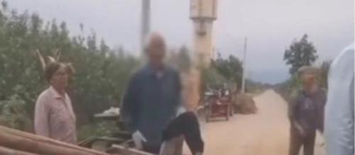 其中,一位大叔在一条不算太宽的乡村公路上跨过滑板车,一只脚踩在滑板车上,悠闲地抽着烟。另外四个是大妈,其中三个主要是站在车前看热闹,另一个穿着紫黑色花纹衣服的大妈是“主力”,站在窗边和司机一行人交流。