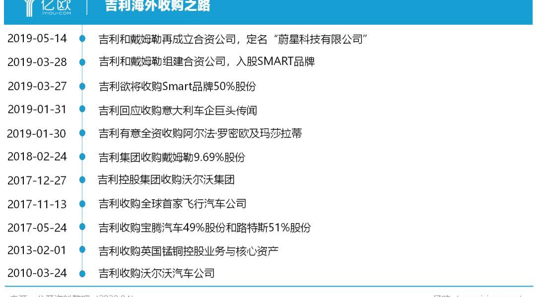 制表人/亿欧汽车商业分析师闫然而,吉利和长城并没有轻易放弃,不断加大研发投入,准备“过冬”利器。2月4日,吉利宣布前期投入3.7亿人民币,启动具有防病功能的“全能健康车”研发。长城汽车也曾表示,2020年将投资300亿元用于新能源、智能化等项目,力争在主动安全、智能互联、自动驾驶等方面形成优势。2020年,吉利和长城将不会放松对R&D的投资,新技术可以打造巩固这座城市的壁垒,以应对汽车业的寒冷。在全球化的探索中,吉利和长城被认为是“举着灯笼的人”。在海外扩张方面,吉利比长城更开放。吉利的国际化征程少不了它最爱的独门秘籍:“接受并购”;长城是一砖一瓦砌起来的,大部分东西都是手工做的。自2010年成功收购沃尔沃以来,吉利第一次尝到了“站在巨人肩膀上”的快感。时隔八年,吉利投资戴姆勒,将smart纳入阵营。双方都想在新能源汽车上升级转型。现在的车市和过去不一样了,赛点的机会稍纵即逝。要想抓住机会成为“领头羊”,早一点进入市场就意味着抢得先机,获得更大的利润空间。吉利想成为全球十大企业,通过“买买买”抢占先机抢票提前上车,这是一种发展方式。