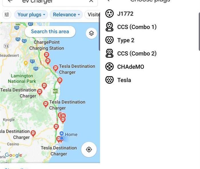 要找到适合自己车辆充电标准的充电站,用户需要打开谷歌地图,在搜索栏中输入“EV CHARGER”,然后选择页面底部显示的蓝色按钮“获取兼容的充电站”。此外,用户可以通过屏幕顶部的下拉菜单点击“Your plugs”,在添加或编辑适合车辆的充电标准后,驾驶员可以在此查看与自己车辆相关的充电站分布信息。
