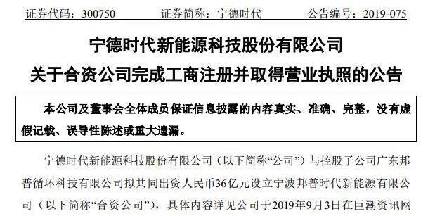 9月3日,当代安普科技股份有限公司发布公告称,为保证公司正极材料的供应,促进公司整体战略目标的实现,公司拟与控股子公司广东邦普循环科技有限公司(以下简称“广东邦普”)出资36亿元共同设立宁波邦普时代新能源有限公司,从事正极材料及相关资源的投资和运营。其中,当代安培科技有限公司出资17.64亿元,持股49%;广东邦普出资18.36亿元,持股51%。昨日,当代安培科技股份有限公司发布公告称,合资公司已在工商登记注册,并领取了北仑区市场监督管理局颁发的营业执照。营业执照相关信息如下:统一社会信用代码:91330206MA2GTTAKX9名称:宁波邦普时代新能源有限公司类型:有限责任公司(自然人投资或控股)地址:浙江省宁波市北仑区梅山大道商务中心29号写字楼128室法定代表人:李长东注册资本:人民币36亿元整成立日期:2019年9月16日营业期限:2019年锂电池材料及贵金属的批发和零售;自营和代理各种货物和技术的进出口业务。当代安培科技有限公司成立于2011年,总部位于福建宁德。公司专注于新能源汽车动力电池系统和储能系统的研发、生产和销售,致力于为全球新能源应用提供解决方案。公司表示,动力电池系统包括电池、模块和电池组,其销售构成公司主要收入来源。今年上半年,公司动力电池系统销售收入168.92亿元,同比增长135.01%。此外,公司继续保持在新能源汽车用锂离子动力电池领域的技术和市场优势。当代安培科技加强R&D投资和市场推广,扩大与产业链上下游公司的合资合作,不断提升储能领域的技术和市场储备。储能市场的布局和推广开始见成效。公司表示,今年上半年,公司储能系统销售收入2.4亿元,同比增长369.55%。公司进一步扩大在锂电池材料回收和生产领域的布局,通过控股子公司投资建设正极材料产业园,并与梅格、青山集团等公司合作在印尼建立湿法镍冶炼厂。今年上半年,公司锂电池材料销售收入23.09亿元,较去年同期增长32.14%。广东邦普的经营范围是电池材料的生产、加工和销售;废二次电池回收技术的开发和转让;电池、镍、钴、铜、镉及其相关材料、产品、配件、五金、销售;收集和出售废镉、镍和电池;R&D及电池材料、电池和储能技术的销售;环境保护项目的设计和开发;网络技术和信息技术的开发、咨询、服务和转让;投资环保产业和电池产业;销售贵金属;货物和技术的进出口。