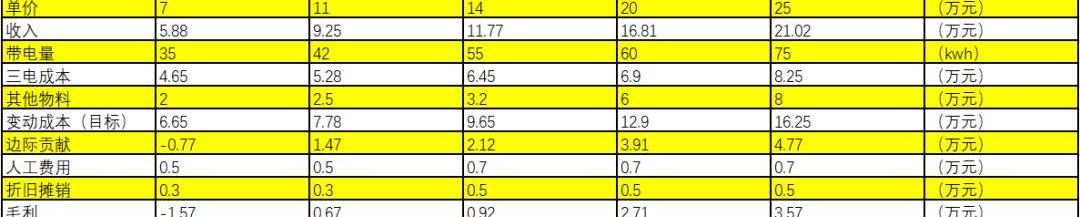 2)单纯靠降低收购价格来应对中期工作是需要时间的,但更长期需要的是在功耗和资源布局上做文章。事实上,三大电力公司的目标成本非常苛刻,可能还需要降低其他材料的成本。通过较低的毛利水平,去掉所有的销售费用和管理费用,对供应方进行积分补偿。这是中期手段。中期工作中:●产品的单价实际上很难突破不同级别的价格上限,所以在用电成本上,必然要减少用电量,相应的提供相同的行驶里程,极度降低小型化车辆中的功耗。●还有一个突破,就是提高车辆价格,尽可能在价格相对较高的60kWh、75kWh的车上做一些突破。