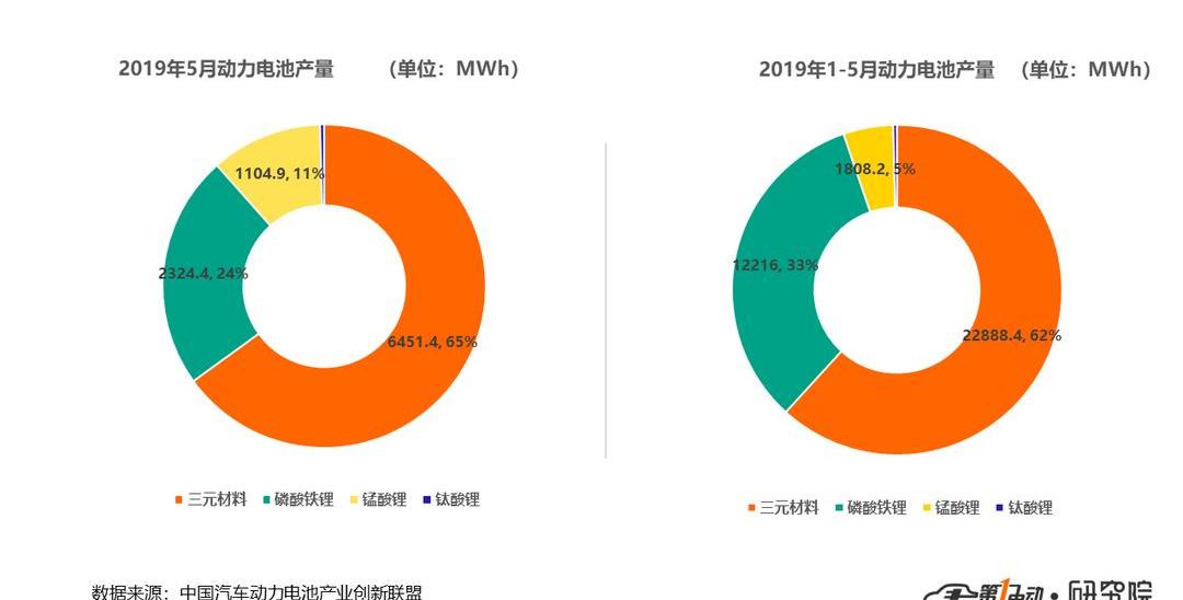 3 6月12日,中国汽车动力电池产业创新联盟发布了2019年5月新能源汽车电池产量和装载量数据。产量方面,2019年5月,我国动力电池产量共计9.9GWh,环比增长35.6%。其中,三元电池产量6.5GWh,环比增长49.5%,占总产量的65%;磷酸铁锂电池产量2.3GWh,占总产量的23.4%,环比下降16.9%。5月份锰酸锂电池产量大幅增长,达到1.1GWh,环比增长455.8%。2019年1-5月,我国动力电池累计产量达到37GWh,其中三元电池累计产量22.9GWh,占总产量的61.8%;磷酸铁锂电池累计产量12.2GWh,占总产量的33%;其他材料的电池占5.2%。