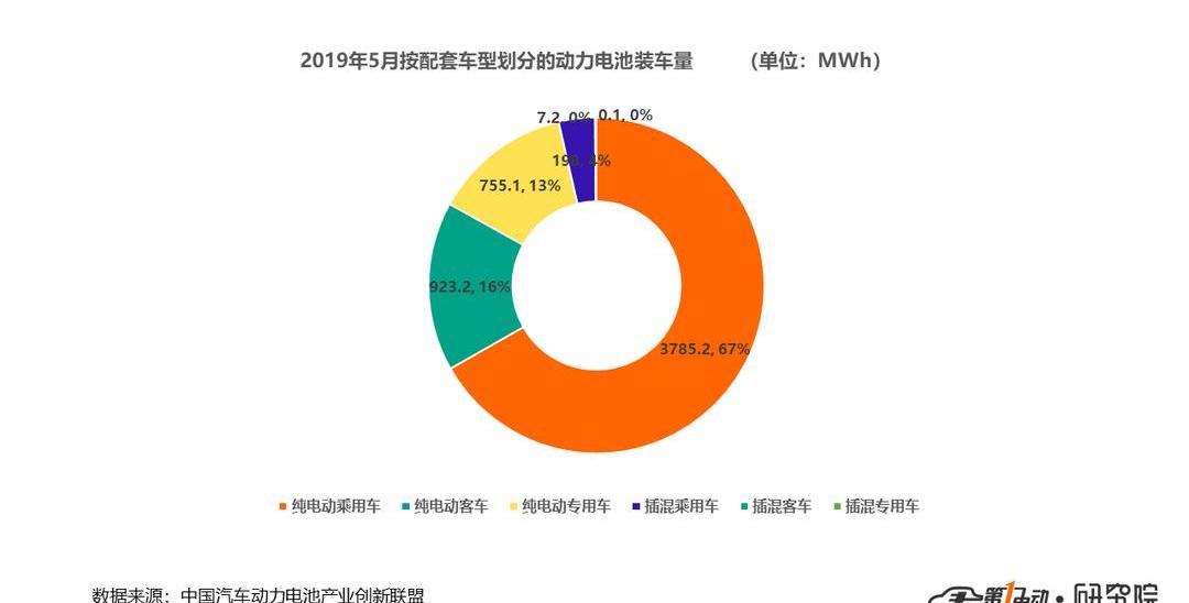 从装载量数据来看,2019年5月,全国动力电池装载量总计5.7GWh,同比增长26.2%,环比增长4.8%;2019年前5个月,我国动力电池加载量累计23.4GWh,同比增长84.6%。5月份三元电池加载量为3.7GWh,与4月份基本持平。磷酸铁锂电池和锰酸锂电池5月份装载量分别为1.8GWh和0.1GWh,环比分别增长16.7%和311.9%。在配套车辆方面,5月份装载的动力电池中,配套纯电动乘用车占比最高,达到66.8%,其次是纯电动客车,占比16.3%。