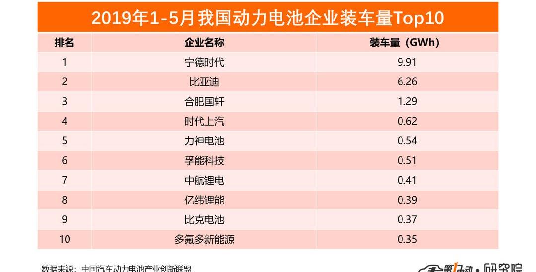 2019年5月,中国新能源汽车市场共有41家动力电池企业实现装车设施,比4月减少两家。其中,排名前十的动力电池企业,动力电池装载量为4.9GWh,占比86.2%。累计来看,2019年1-5月,Top10动力电池企业动力电池装载量为20.7Gwh,占总组装车的88.4%。