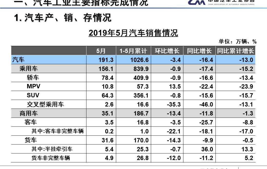 6月12日,中汽协发布了2019年5月汽车行业产销数据。5月份,汽车行业产销整体下行趋势仍未得到有效缓解,产销同比降幅有所扩大,产销分别完成184.8万辆和191.3万辆,比上月分别下降9.9%和3.4%,比去年同期分别下降21.2%和16.4%,分别提高6.7和1.8个百分点。2019年1-5月,汽车产销分别完成1023.7万辆和1026.6万辆,均比上年同期下降13%,降幅分别比1-4月扩大2个和0.8个百分点。